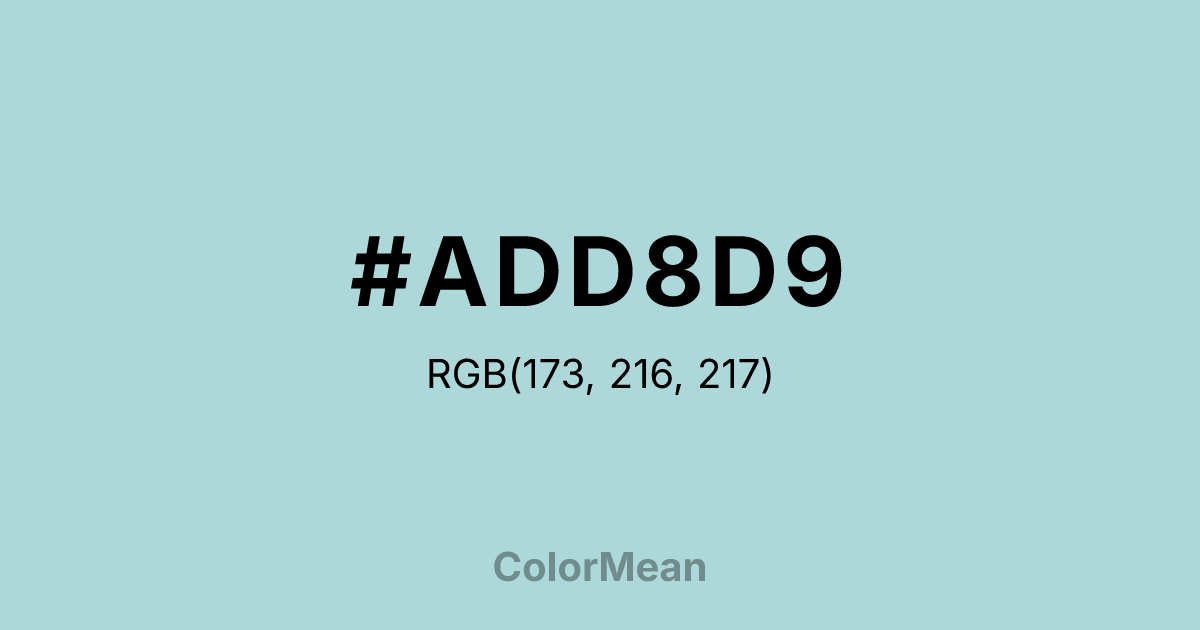 #ADD8D9 RGB value is (173, 216, 217). The hex color red value is 173, green is 216, and blue is 217. Its HSL format shows a hue of 181°, saturation of 37 percent, and lightness of 76 percent. The CMYK process values are 20 percent, 0 percent, 0 percent, 15 percent.