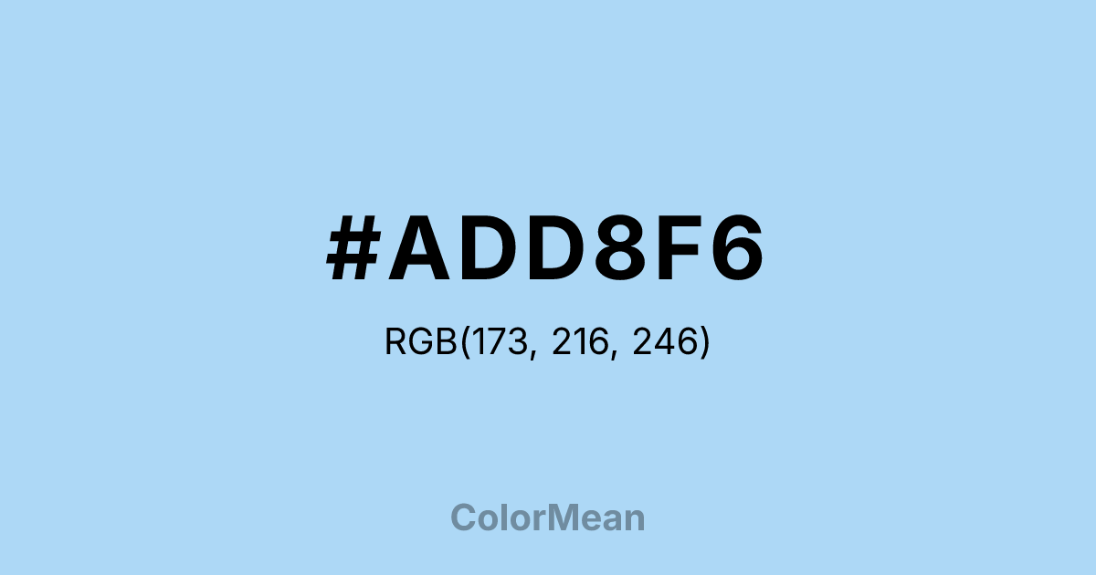 #ADD8F6 RGB value is (173, 216, 246). The hex color red value is 173, green is 216, and blue is 246. Its HSL format shows a hue of 205°, saturation of 80 percent, and lightness of 82 percent. The CMYK process values are 30 percent, 12 percent, 0 percent, 4 percent.