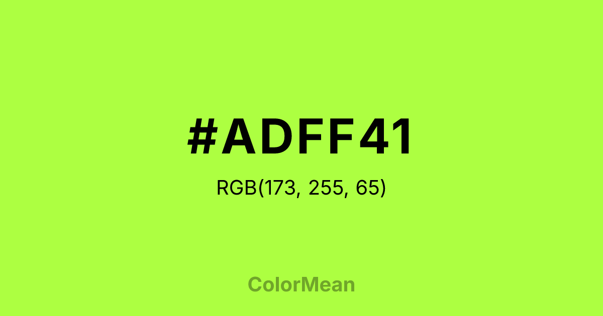 #ADFF41 RGB value is (173, 255, 65). The hex color red value is 173, green is 255, and blue is 65. Its HSL format shows a hue of 86°, saturation of 100 percent, and lightness of 63 percent. The CMYK process values are 32 percent, 0 percent, 75 percent, 0 percent.
