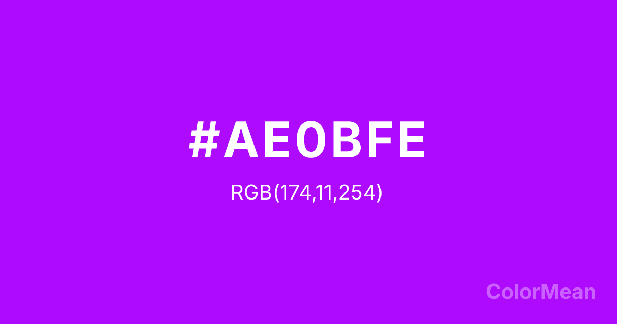 #AE0BFE RGB value is (174, 11, 254). The hex color red value is 174, green is 11, and blue is 254. Its HSL format shows a hue of 280°, saturation of 99 percent, and lightness of 52 percent. The CMYK process values are 31 percent, 96 percent, 0 percent, 0 percent.