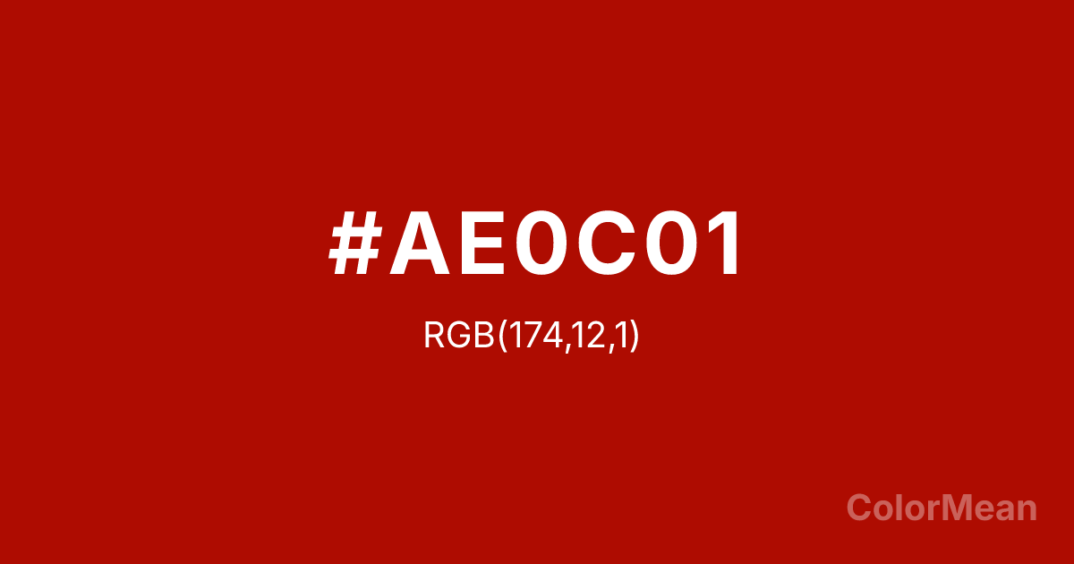 #AE0C01 RGB value is (174, 12, 1). The hex color red value is 174, green is 12, and blue is 1. Its HSL format shows a hue of 4°, saturation of 99 percent, and lightness of 34 percent. The CMYK process values are 0 percent, 93 percent, 99 percent, 32 percent.