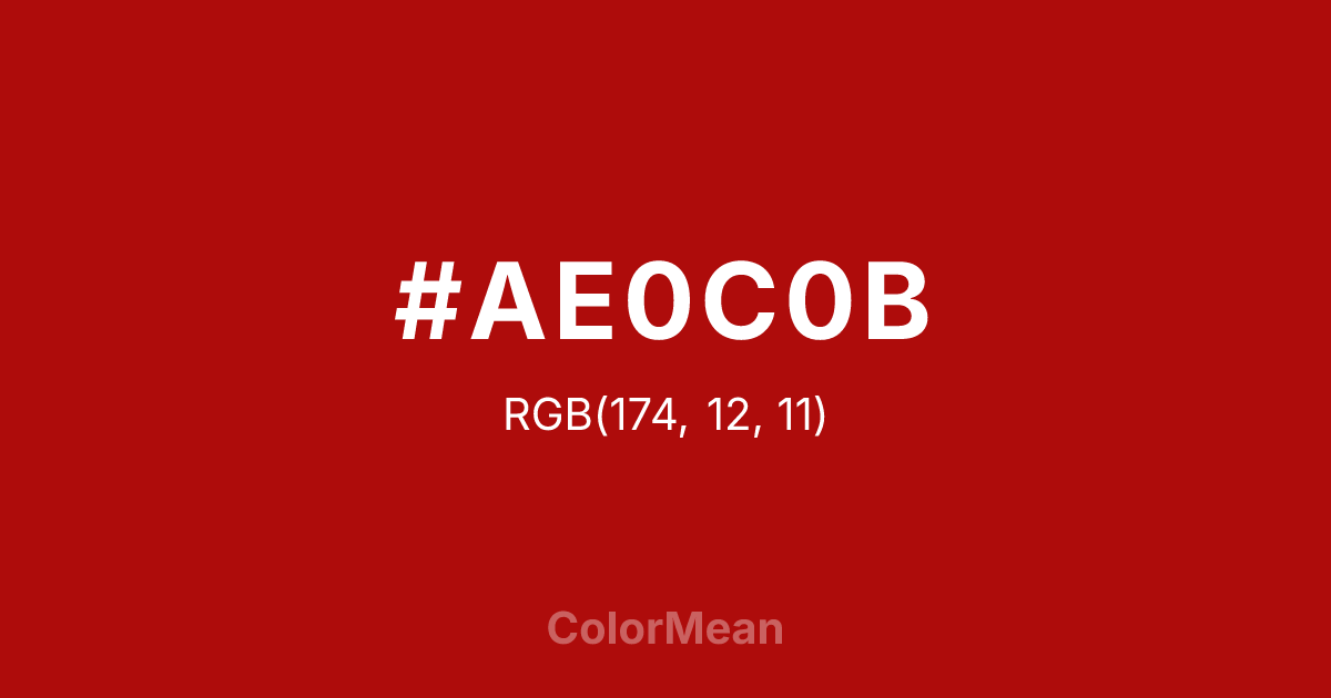 #AE0C0B RGB value is (174, 12, 11). The hex color red value is 174, green is 12, and blue is 11. Its HSL format shows a hue of 0°, saturation of 88 percent, and lightness of 36 percent. The CMYK process values are 0 percent, 93 percent, 94 percent, 32 percent.