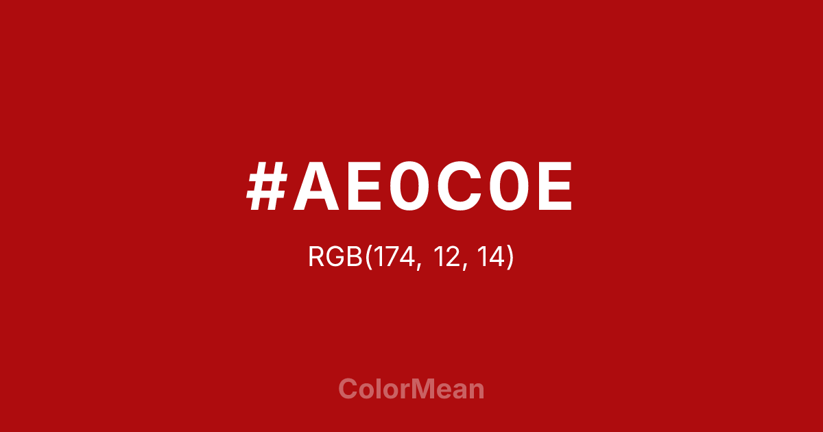 #AE0C0E RGB value is (174, 12, 14). The hex color red value is 174, green is 12, and blue is 14. Its HSL format shows a hue of 359°, saturation of 87 percent, and lightness of 36 percent. The CMYK process values are 0 percent, 93 percent, 92 percent, 32 percent.