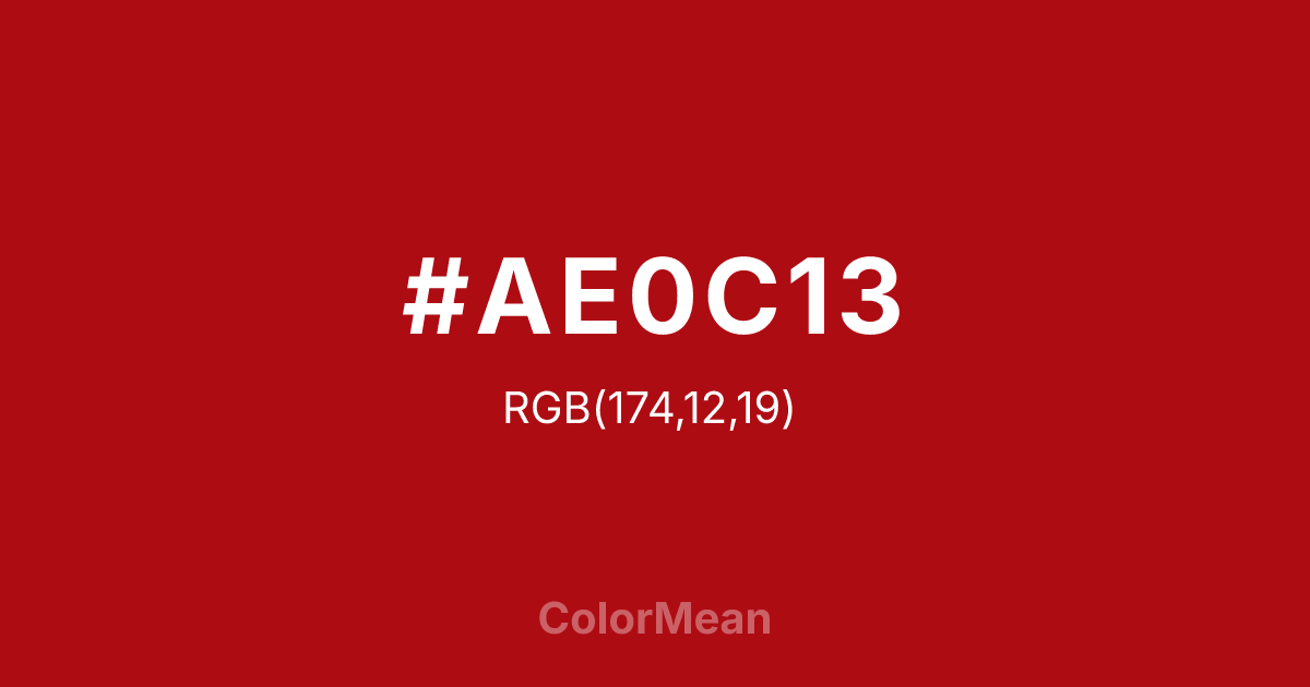 #AE0C13 RGB value is (174, 12, 19). The hex color red value is 174, green is 12, and blue is 19. Its HSL format shows a hue of 357°, saturation of 87 percent, and lightness of 36 percent. The CMYK process values are 0 percent, 93 percent, 89 percent, 32 percent.