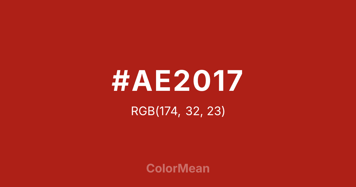 #AE2017 RGB value is (174, 32, 23). The hex color red value is 174, green is 32, and blue is 23. Its HSL format shows a hue of 4°, saturation of 77 percent, and lightness of 39 percent. The CMYK process values are 0 percent, 82 percent, 87 percent, 32 percent.