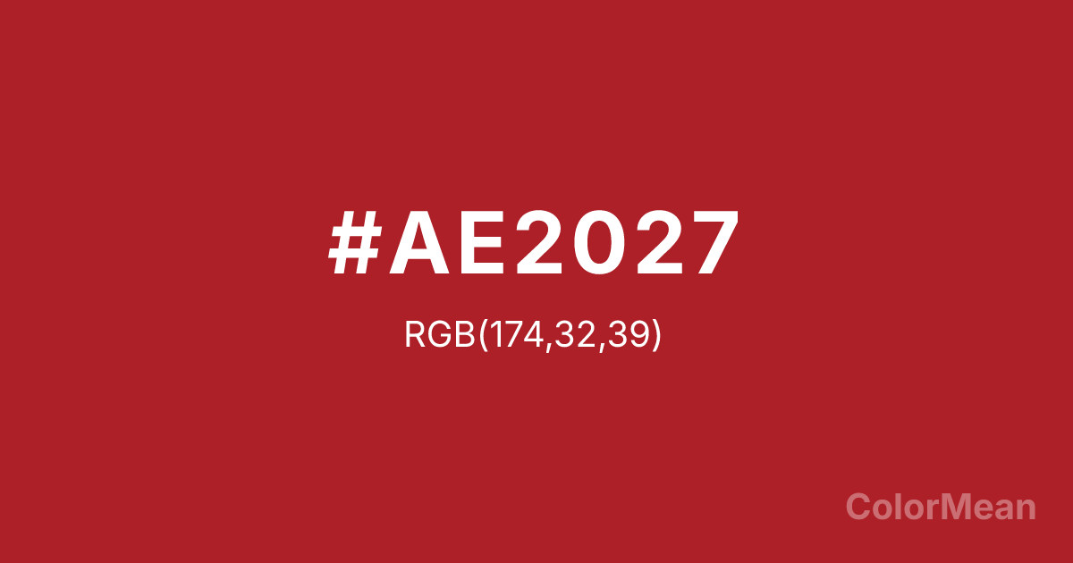 #AE2027 RGB value is (174, 32, 39). The hex color red value is 174, green is 32, and blue is 39. Its HSL format shows a hue of 357°, saturation of 69 percent, and lightness of 40 percent. The CMYK process values are 0 percent, 82 percent, 78 percent, 32 percent.