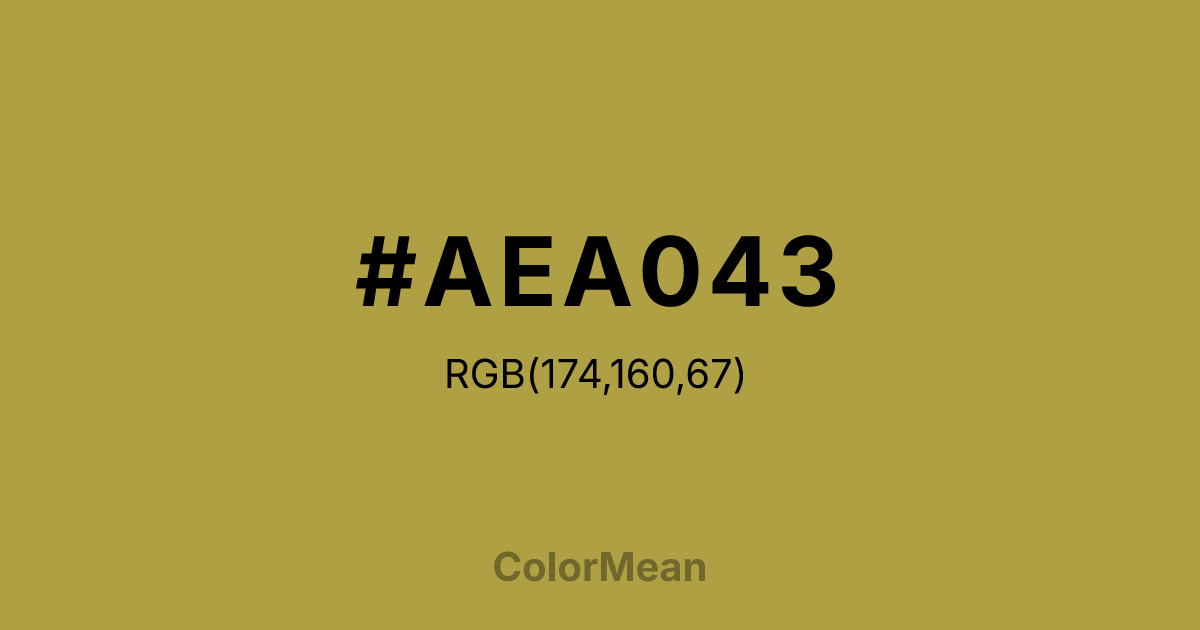 #AEA043 RGB value is (174, 160, 67). The hex color red value is 174, green is 160, and blue is 67. Its HSL format shows a hue of 52°, saturation of 44 percent, and lightness of 47 percent. The CMYK process values are 0 percent, 8 percent, 61 percent, 32 percent.