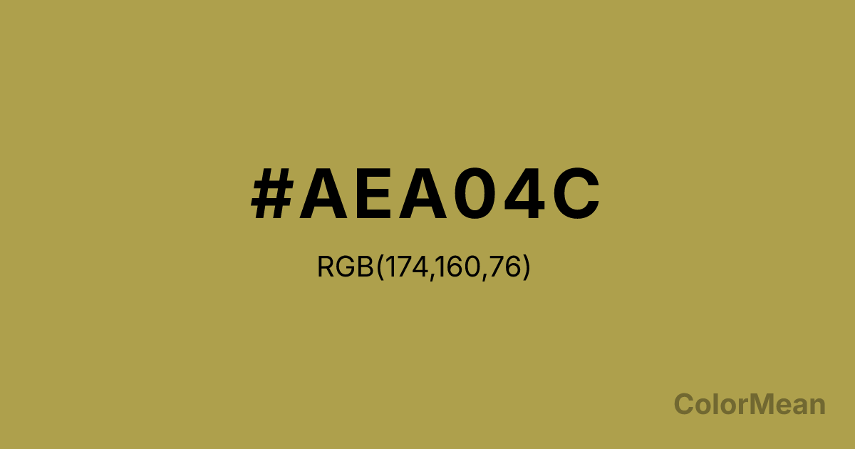 #AEA04C RGB value is (174, 160, 76). The hex color red value is 174, green is 160, and blue is 76. Its HSL format shows a hue of 51°, saturation of 39 percent, and lightness of 49 percent. The CMYK process values are 0 percent, 8 percent, 56 percent, 32 percent.