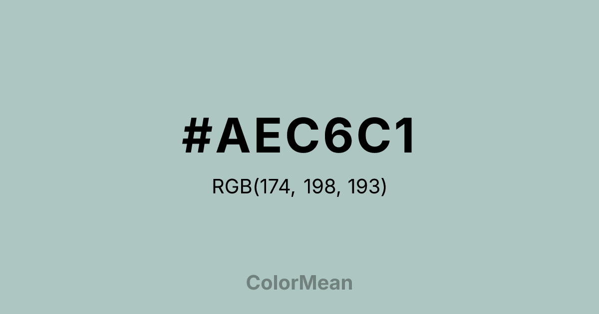 #AEC6C1 RGB value is (174, 198, 193). The hex color red value is 174, green is 198, and blue is 193. Its HSL format shows a hue of 167°, saturation of 17 percent, and lightness of 73 percent. The CMYK process values are 12 percent, 0 percent, 3 percent, 22 percent.