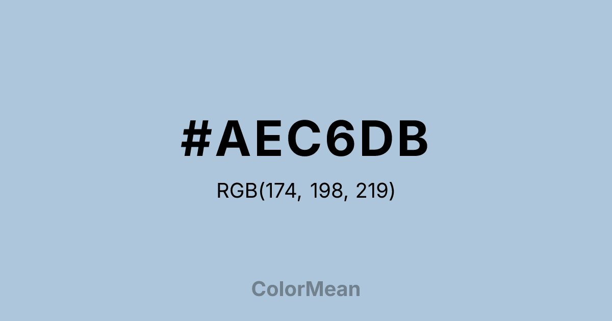 #AEC6DB RGB value is (174, 198, 219). The hex color red value is 174, green is 198, and blue is 219. Its HSL format shows a hue of 208°, saturation of 38 percent, and lightness of 77 percent. The CMYK process values are 21 percent, 10 percent, 0 percent, 14 percent.