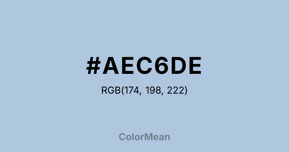 #AEC6DE RGB value is (174, 198, 222). The hex color red value is 174, green is 198, and blue is 222. Its HSL format shows a hue of 210°, saturation of 42 percent, and lightness of 78 percent. The CMYK process values are 22 percent, 11 percent, 0 percent, 13 percent.