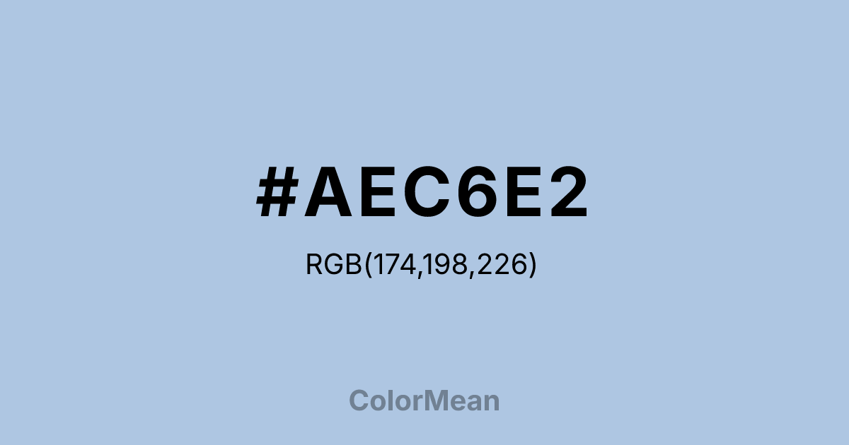 #AEC6E2 RGB value is (174, 198, 226). The hex color red value is 174, green is 198, and blue is 226. Its HSL format shows a hue of 212°, saturation of 47 percent, and lightness of 78 percent. The CMYK process values are 23 percent, 12 percent, 0 percent, 11 percent.