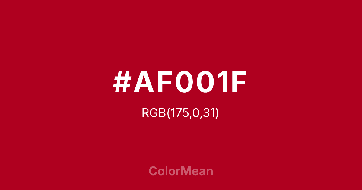 #AF001F RGB value is (175, 0, 31). The hex color red value is 175, green is 0, and blue is 31. Its HSL format shows a hue of 349°, saturation of 100 percent, and lightness of 34 percent. The CMYK process values are 0 percent, 100 percent, 82 percent, 31 percent.