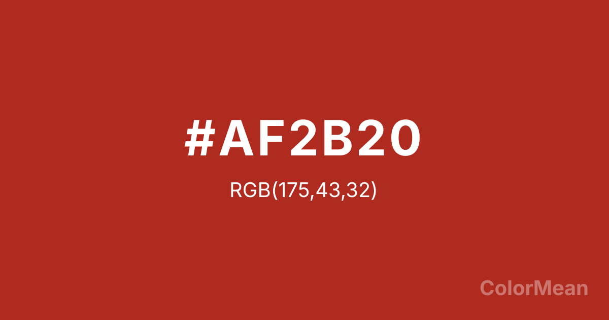 #AF2B20 RGB value is (175, 43, 32). The hex color red value is 175, green is 43, and blue is 32. Its HSL format shows a hue of 5°, saturation of 69 percent, and lightness of 41 percent. The CMYK process values are 0 percent, 75 percent, 82 percent, 31 percent.