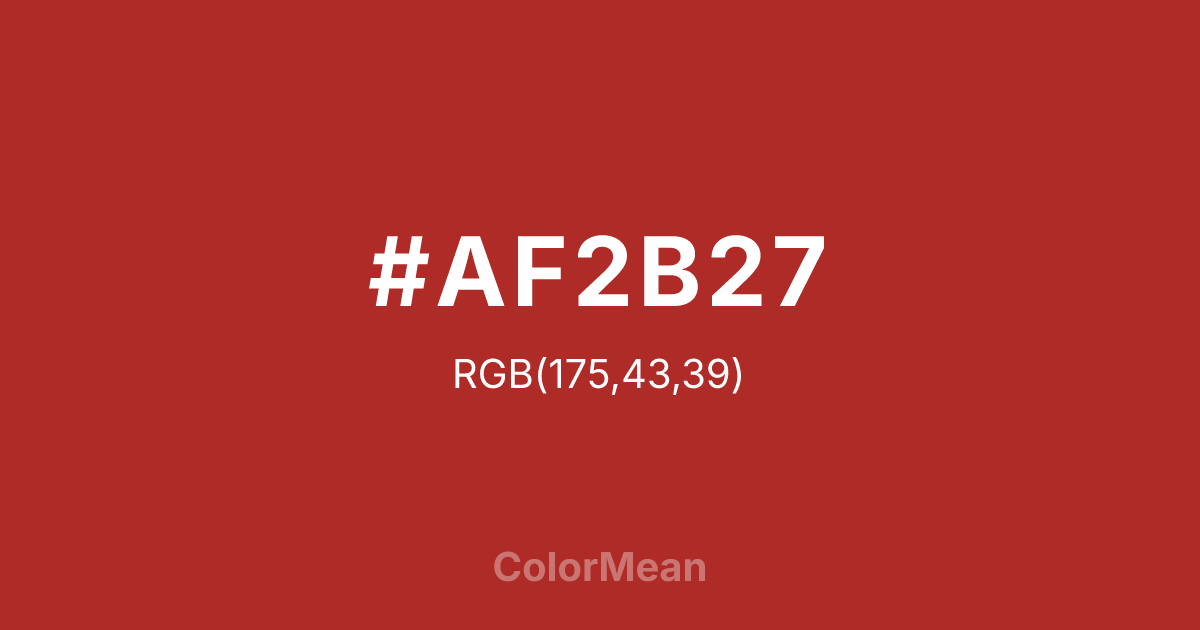 #AF2B27 RGB value is (175, 43, 39). The hex color red value is 175, green is 43, and blue is 39. Its HSL format shows a hue of 2°, saturation of 64 percent, and lightness of 42 percent. The CMYK process values are 0 percent, 75 percent, 78 percent, 31 percent.