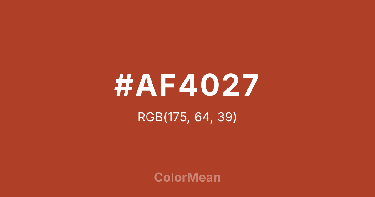 #AF4027 RGB value is (175, 64, 39). The hex color red value is 175, green is 64, and blue is 39. Its HSL format shows a hue of 11°, saturation of 64 percent, and lightness of 42 percent. The CMYK process values are 0 percent, 63 percent, 78 percent, 31 percent.