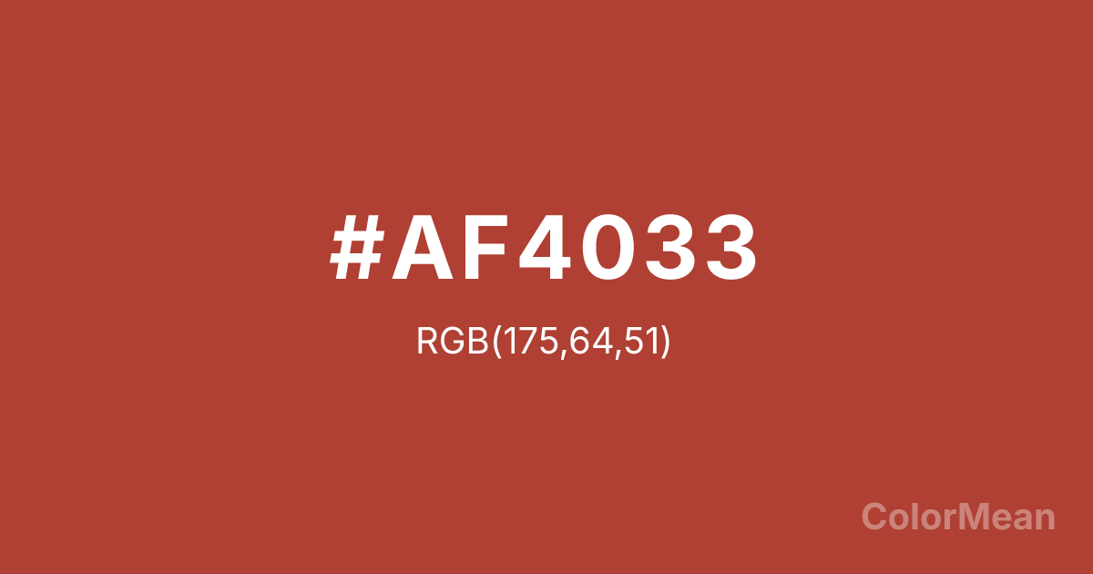 #AF4033 RGB value is (175, 64, 51). The hex color red value is 175, green is 64, and blue is 51. Its HSL format shows a hue of 6°, saturation of 55 percent, and lightness of 44 percent. The CMYK process values are 0 percent, 63 percent, 71 percent, 31 percent.