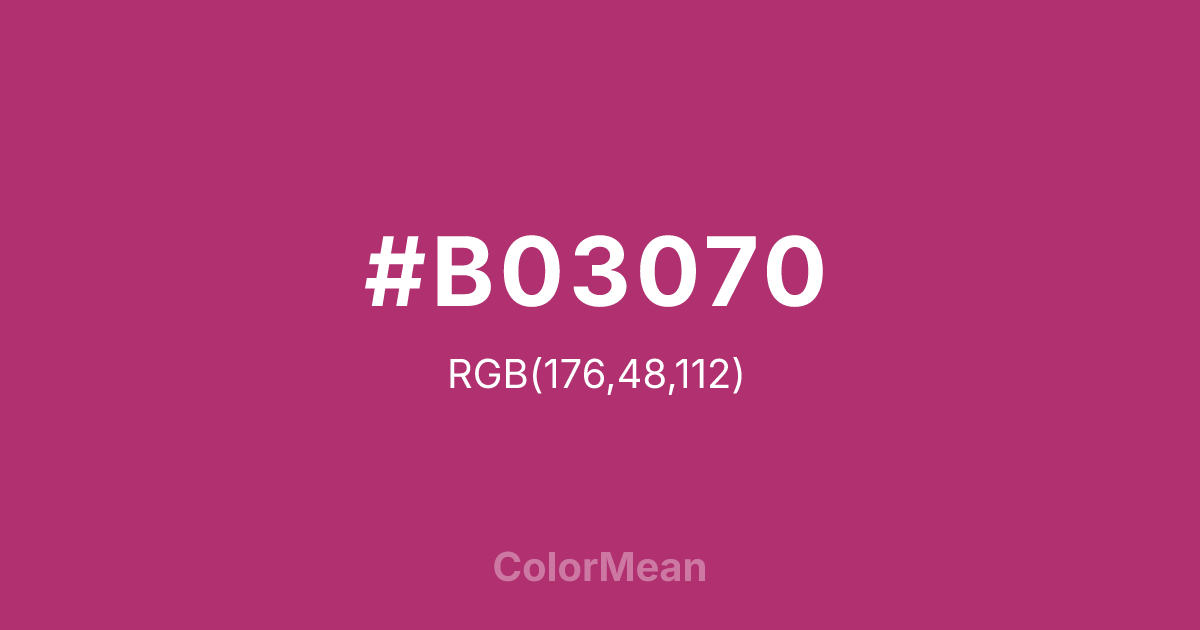 #B03070 RGB value is (176, 48, 112). The hex color red value is 176, green is 48, and blue is 112. Its HSL format shows a hue of 330°, saturation of 57 percent, and lightness of 44 percent. The CMYK process values are 0 percent, 73 percent, 36 percent, 31 percent.