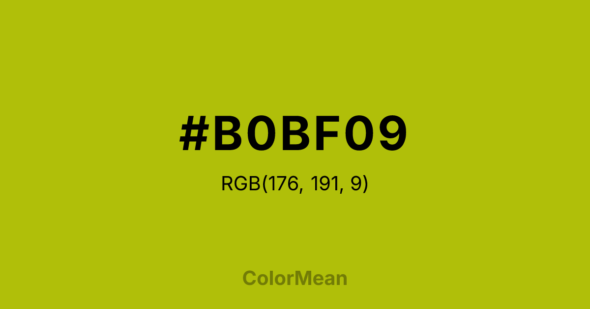 #B0BF09 RGB value is (176, 191, 9). The hex color red value is 176, green is 191, and blue is 9. Its HSL format shows a hue of 65°, saturation of 91 percent, and lightness of 39 percent. The CMYK process values are 8 percent, 0 percent, 95 percent, 25 percent.