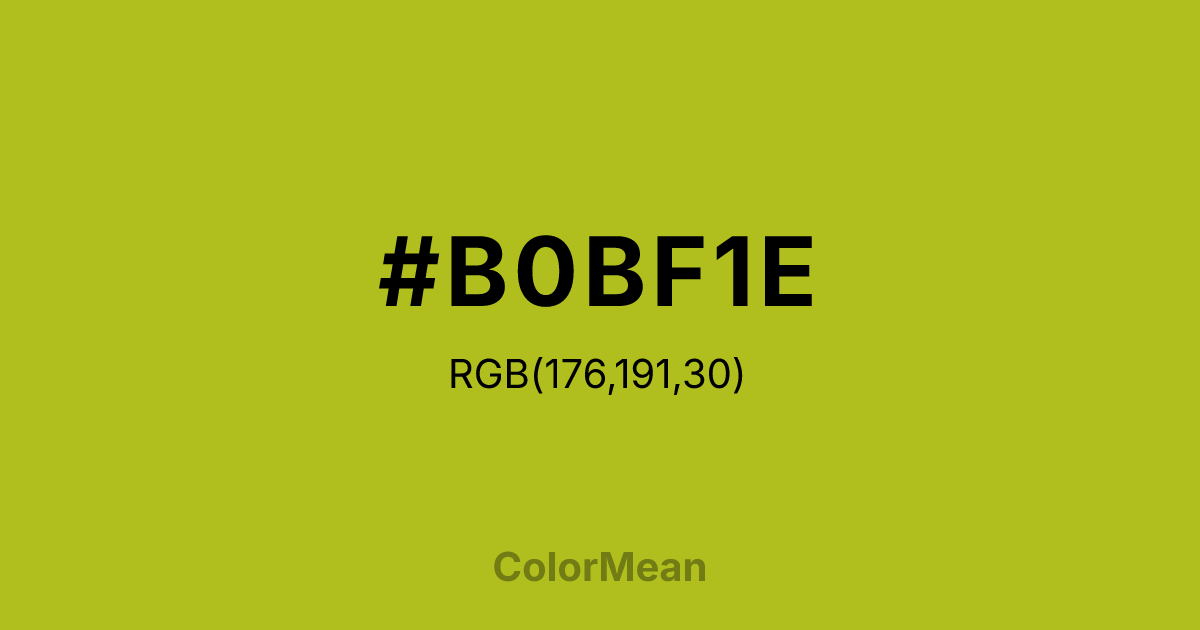 #B0BF1E RGB value is (176, 191, 30). The hex color red value is 176, green is 191, and blue is 30. Its HSL format shows a hue of 66°, saturation of 73 percent, and lightness of 43 percent. The CMYK process values are 8 percent, 0 percent, 84 percent, 25 percent.