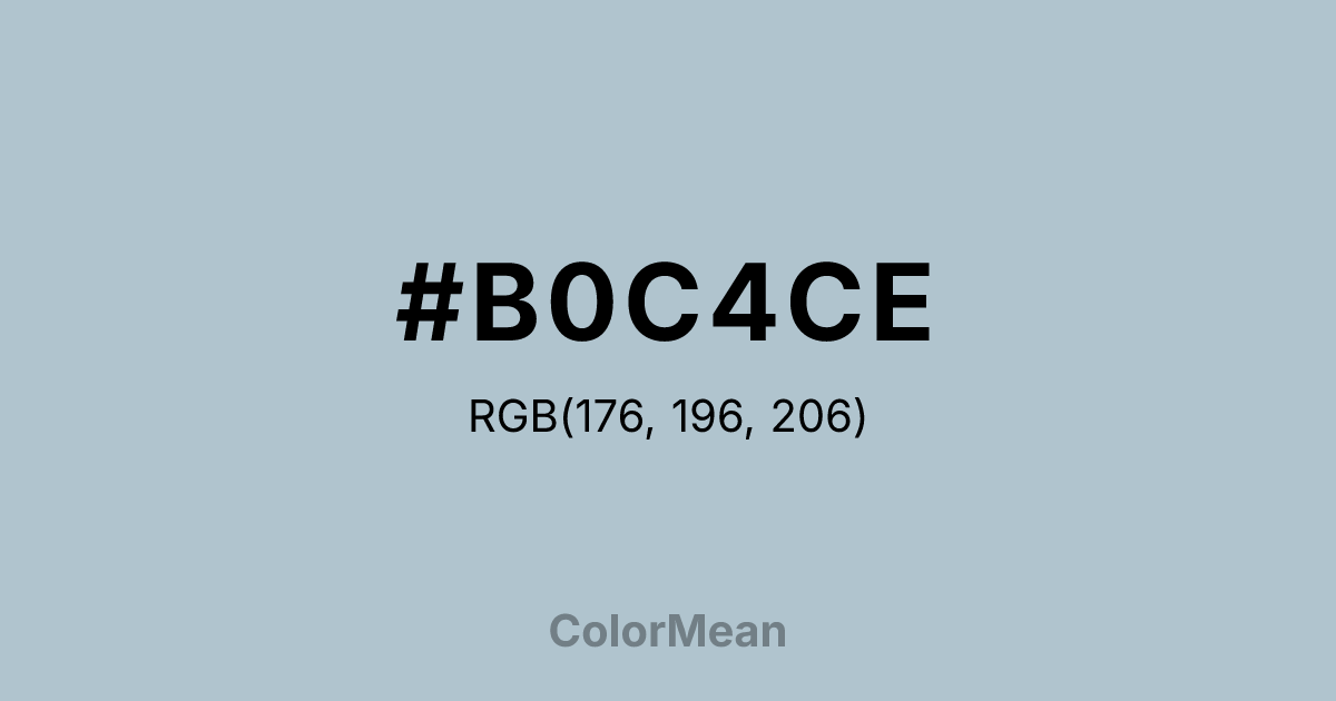 #B0C4CE RGB value is (176, 196, 206). The hex color red value is 176, green is 196, and blue is 206. Its HSL format shows a hue of 200°, saturation of 23 percent, and lightness of 75 percent. The CMYK process values are 15 percent, 5 percent, 0 percent, 19 percent.