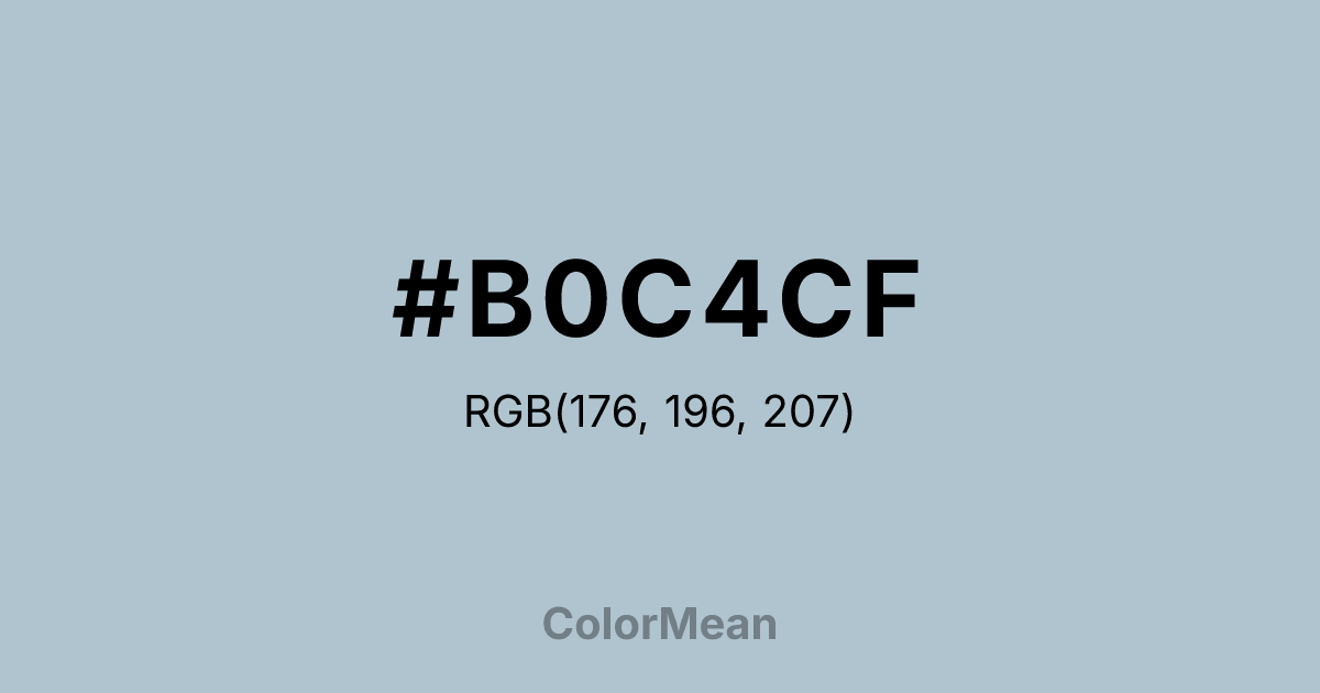 #B0C4CF RGB value is (176, 196, 207). The hex color red value is 176, green is 196, and blue is 207. Its HSL format shows a hue of 201°, saturation of 24 percent, and lightness of 75 percent. The CMYK process values are 15 percent, 5 percent, 0 percent, 19 percent.