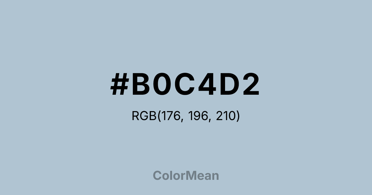 #B0C4D2 RGB value is (176, 196, 210). The hex color red value is 176, green is 196, and blue is 210. Its HSL format shows a hue of 205°, saturation of 27 percent, and lightness of 76 percent. The CMYK process values are 16 percent, 7 percent, 0 percent, 18 percent.