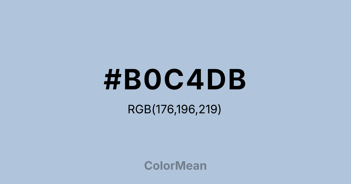 #B0C4DB RGB value is (176, 196, 219). The hex color red value is 176, green is 196, and blue is 219. Its HSL format shows a hue of 212°, saturation of 37 percent, and lightness of 77 percent. The CMYK process values are 20 percent, 11 percent, 0 percent, 14 percent.