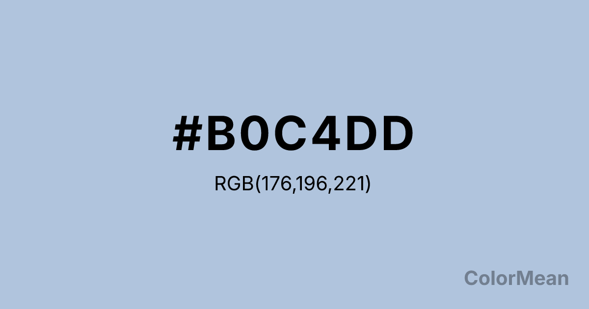 #B0C4DD RGB value is (176, 196, 221). The hex color red value is 176, green is 196, and blue is 221. Its HSL format shows a hue of 213°, saturation of 40 percent, and lightness of 78 percent. The CMYK process values are 20 percent, 11 percent, 0 percent, 13 percent.