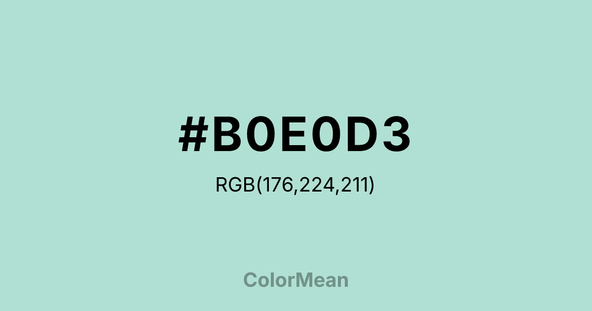 #B0E0D3 RGB value is (176, 224, 211). The hex color red value is 176, green is 224, and blue is 211. Its HSL format shows a hue of 164°, saturation of 44 percent, and lightness of 78 percent. The CMYK process values are 21 percent, 0 percent, 6 percent, 12 percent.