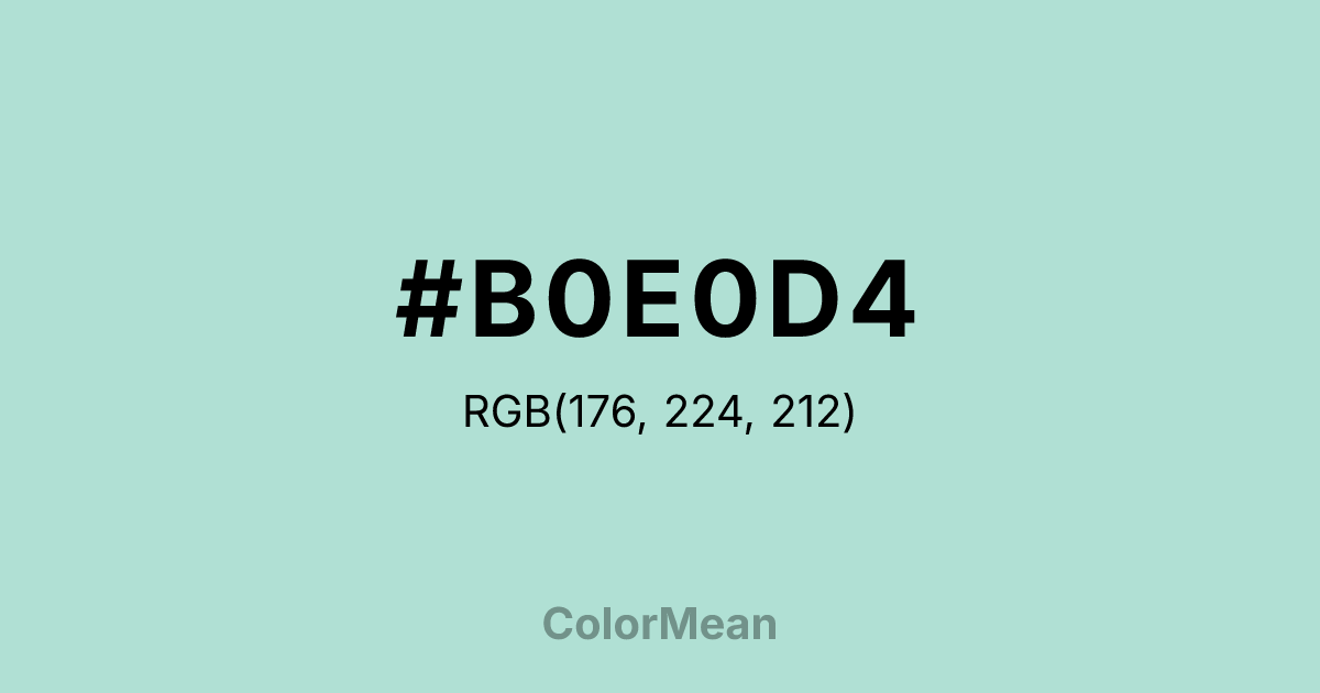 #B0E0D4 RGB value is (176, 224, 212). The hex color red value is 176, green is 224, and blue is 212. Its HSL format shows a hue of 165°, saturation of 44 percent, and lightness of 78 percent. The CMYK process values are 21 percent, 0 percent, 5 percent, 12 percent.