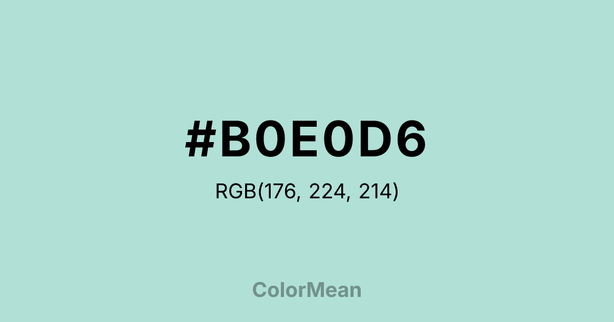 #B0E0D6 RGB value is (176, 224, 214). The hex color red value is 176, green is 224, and blue is 214. Its HSL format shows a hue of 168°, saturation of 44 percent, and lightness of 78 percent. The CMYK process values are 21 percent, 0 percent, 4 percent, 12 percent.