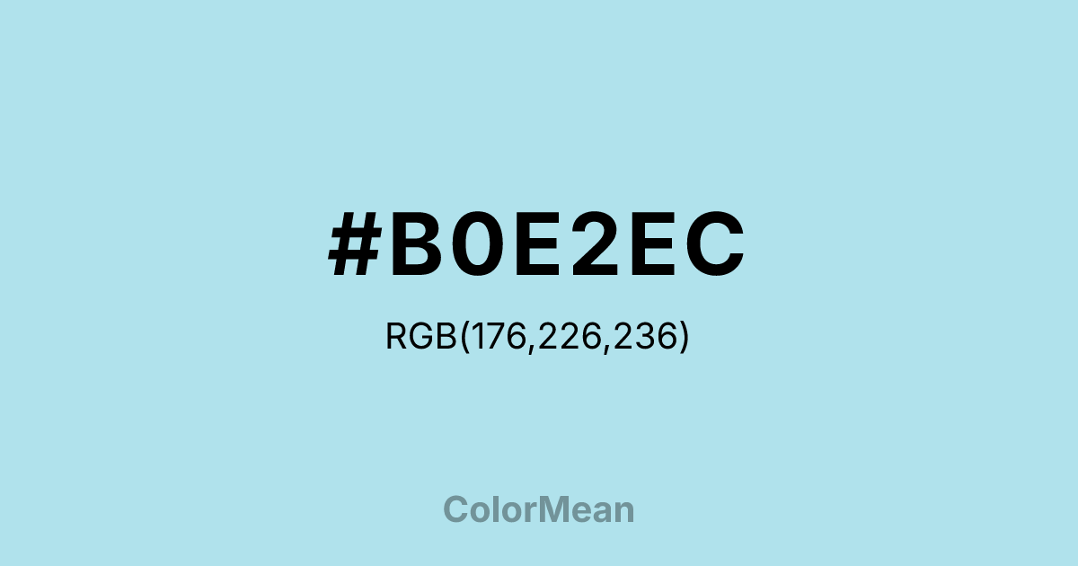 #B0E2EC RGB value is (176, 226, 236). The hex color red value is 176, green is 226, and blue is 236. Its HSL format shows a hue of 190°, saturation of 61 percent, and lightness of 81 percent. The CMYK process values are 25 percent, 4 percent, 0 percent, 7 percent.