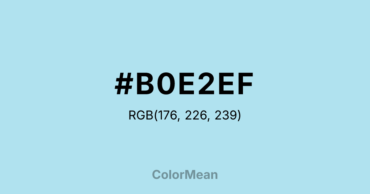 #B0E2EF RGB value is (176, 226, 239). The hex color red value is 176, green is 226, and blue is 239. Its HSL format shows a hue of 192°, saturation of 66 percent, and lightness of 81 percent. The CMYK process values are 26 percent, 5 percent, 0 percent, 6 percent.
