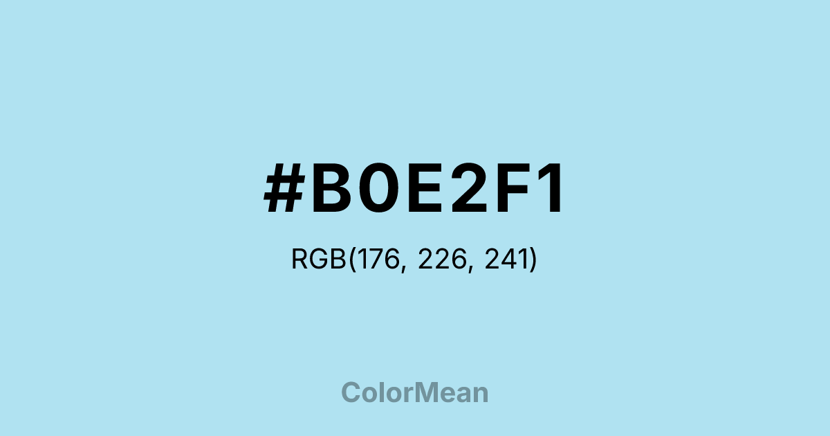 #B0E2F1 RGB value is (176, 226, 241). The hex color red value is 176, green is 226, and blue is 241. Its HSL format shows a hue of 194°, saturation of 70 percent, and lightness of 82 percent. The CMYK process values are 27 percent, 6 percent, 0 percent, 5 percent.