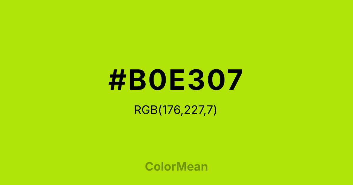 #B0E307 RGB value is (176, 227, 7). The hex color red value is 176, green is 227, and blue is 7. Its HSL format shows a hue of 74°, saturation of 94 percent, and lightness of 46 percent. The CMYK process values are 22 percent, 0 percent, 97 percent, 11 percent.