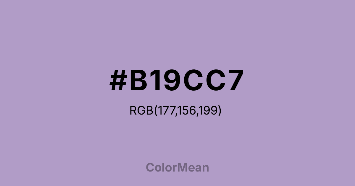 #B19CC7 RGB value is (177, 156, 199). The hex color red value is 177, green is 156, and blue is 199. Its HSL format shows a hue of 269°, saturation of 28 percent, and lightness of 70 percent. The CMYK process values are 11 percent, 22 percent, 0 percent, 22 percent.