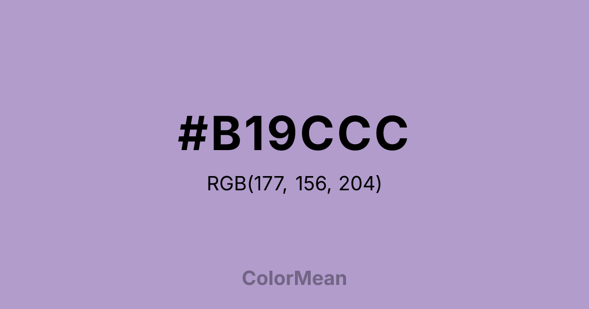 #B19CCC RGB value is (177, 156, 204). The hex color red value is 177, green is 156, and blue is 204. Its HSL format shows a hue of 266°, saturation of 32 percent, and lightness of 71 percent. The CMYK process values are 13 percent, 24 percent, 0 percent, 20 percent.