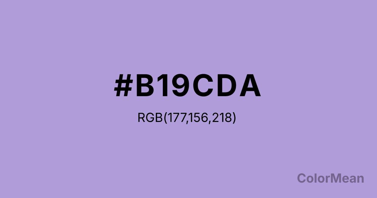 #B19CDA RGB value is (177, 156, 218). The hex color red value is 177, green is 156, and blue is 218. Its HSL format shows a hue of 260°, saturation of 46 percent, and lightness of 73 percent. The CMYK process values are 19 percent, 28 percent, 0 percent, 15 percent.