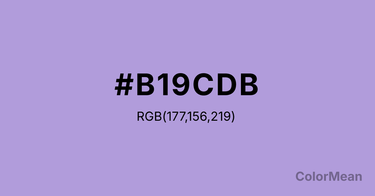 #B19CDB RGB value is (177, 156, 219). The hex color red value is 177, green is 156, and blue is 219. Its HSL format shows a hue of 260°, saturation of 47 percent, and lightness of 74 percent. The CMYK process values are 19 percent, 29 percent, 0 percent, 14 percent.