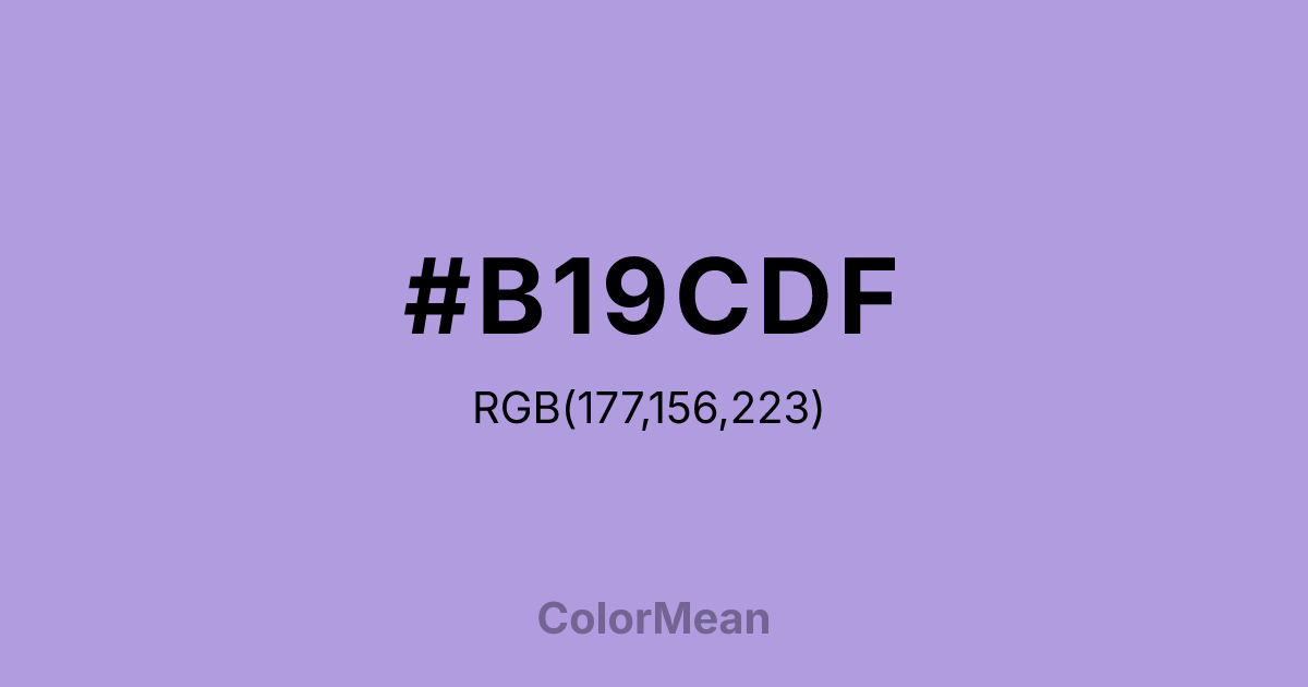 #B19CDF RGB value is (177, 156, 223). The hex color red value is 177, green is 156, and blue is 223. Its HSL format shows a hue of 259°, saturation of 51 percent, and lightness of 74 percent. The CMYK process values are 21 percent, 30 percent, 0 percent, 13 percent.
