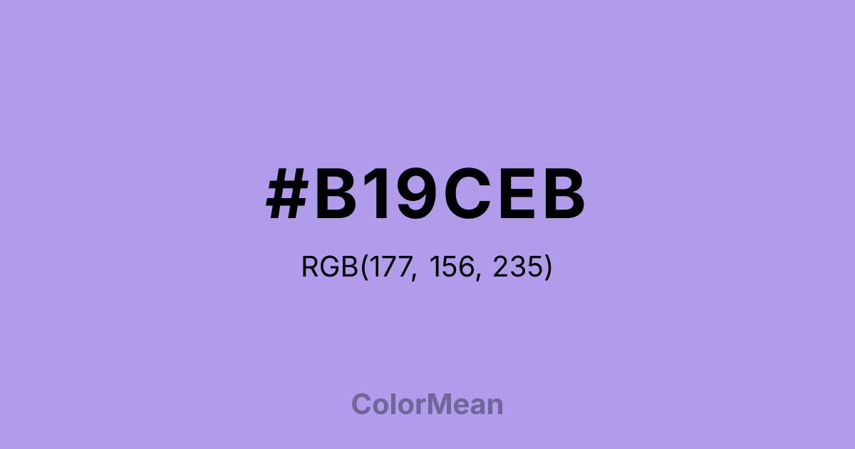 #B19CEB RGB value is (177, 156, 235). The hex color red value is 177, green is 156, and blue is 235. Its HSL format shows a hue of 256°, saturation of 66 percent, and lightness of 77 percent. The CMYK process values are 25 percent, 34 percent, 0 percent, 8 percent.