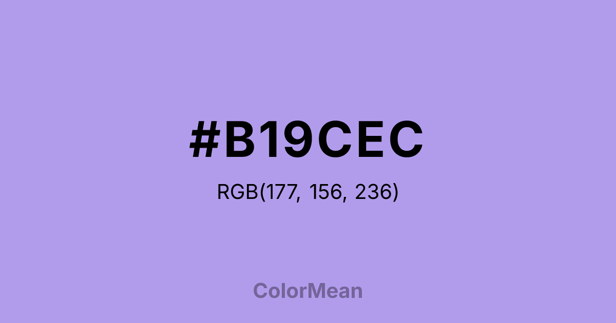 #B19CEC RGB value is (177, 156, 236). The hex color red value is 177, green is 156, and blue is 236. Its HSL format shows a hue of 256°, saturation of 68 percent, and lightness of 77 percent. The CMYK process values are 25 percent, 34 percent, 0 percent, 7 percent.