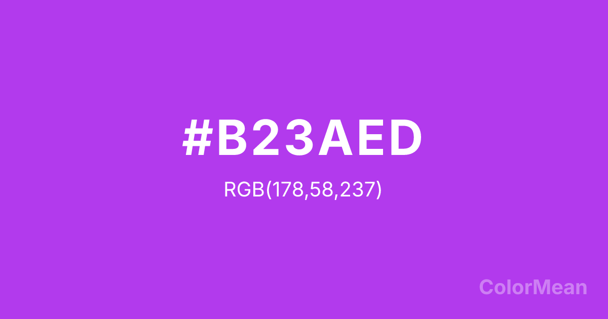 #B23AED RGB value is (178, 58, 237). The hex color red value is 178, green is 58, and blue is 237. Its HSL format shows a hue of 280°, saturation of 83 percent, and lightness of 58 percent. The CMYK process values are 25 percent, 76 percent, 0 percent, 7 percent.