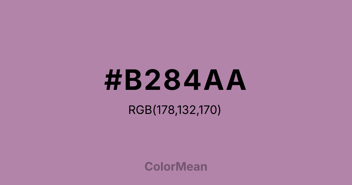 #B284AA RGB value is (178, 132, 170). The hex color red value is 178, green is 132, and blue is 170. Its HSL format shows a hue of 310°, saturation of 23 percent, and lightness of 61 percent. The CMYK process values are 0 percent, 26 percent, 4 percent, 30 percent.