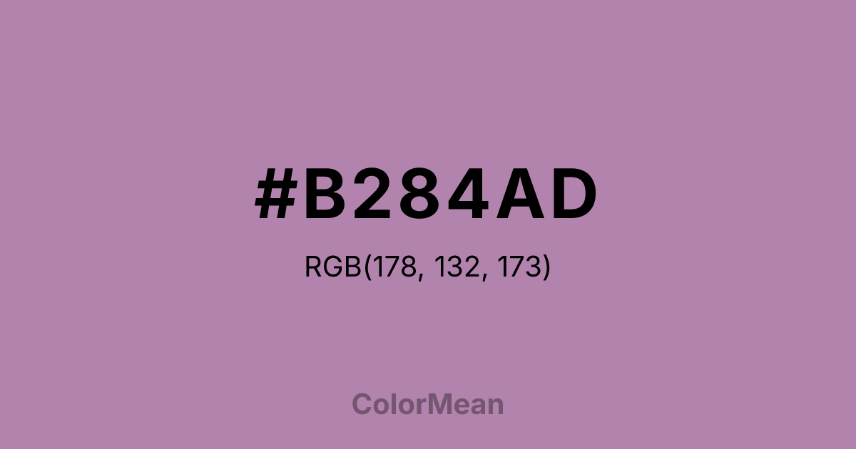 #B284AD RGB value is (178, 132, 173). The hex color red value is 178, green is 132, and blue is 173. Its HSL format shows a hue of 307°, saturation of 23 percent, and lightness of 61 percent. The CMYK process values are 0 percent, 26 percent, 3 percent, 30 percent.