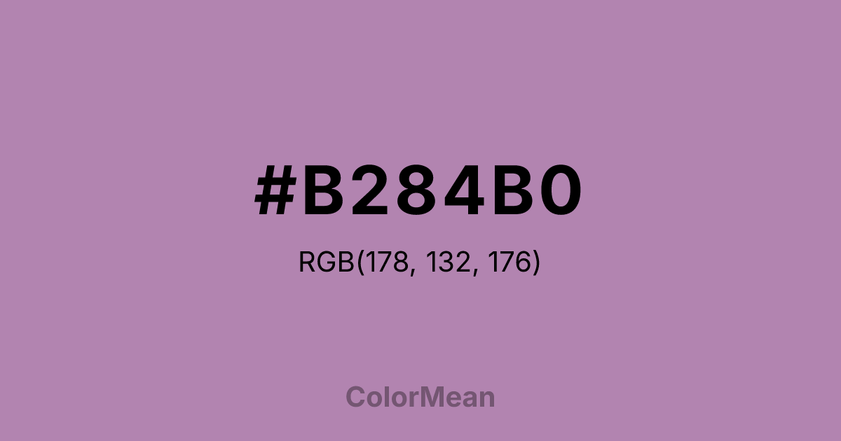 #B284B0 RGB value is (178, 132, 176). The hex color red value is 178, green is 132, and blue is 176. Its HSL format shows a hue of 303°, saturation of 23 percent, and lightness of 61 percent. The CMYK process values are 0 percent, 26 percent, 1 percent, 30 percent.