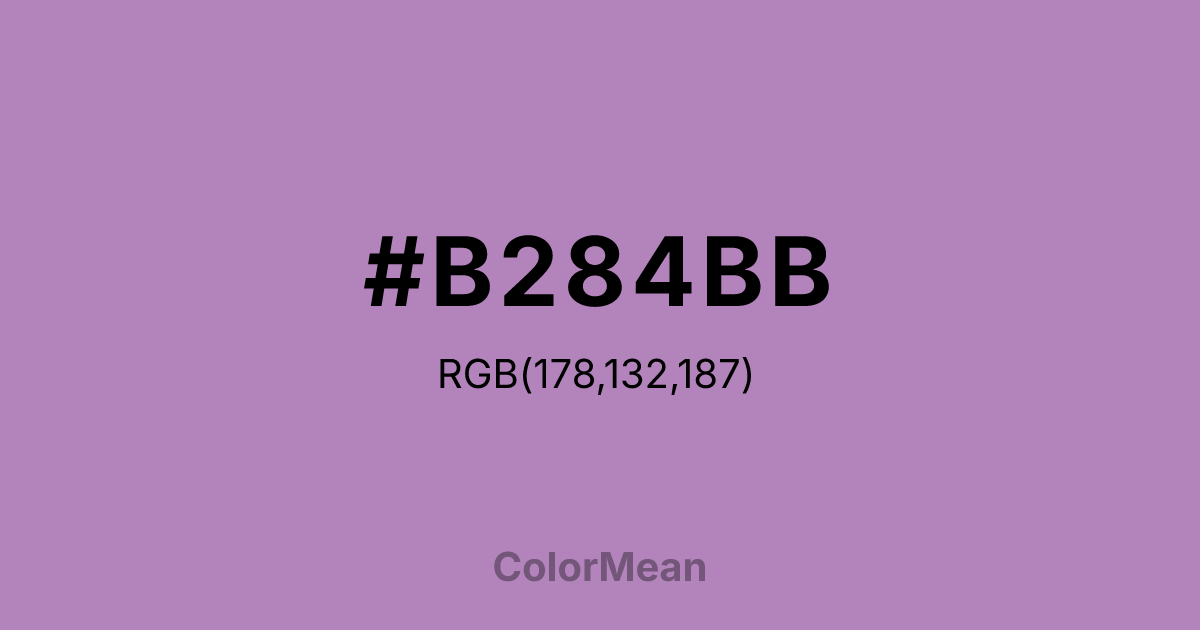 #B284BB RGB value is (178, 132, 187). The hex color red value is 178, green is 132, and blue is 187. Its HSL format shows a hue of 290°, saturation of 29 percent, and lightness of 63 percent. The CMYK process values are 5 percent, 29 percent, 0 percent, 27 percent.