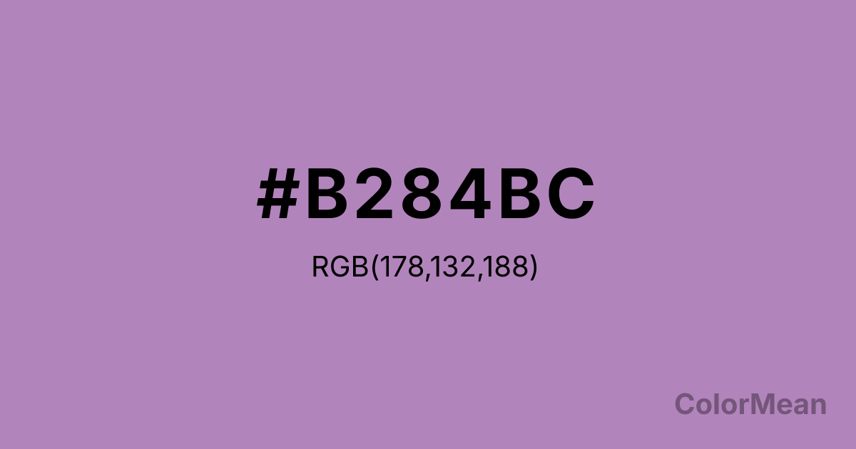 #B284BC RGB value is (178, 132, 188). The hex color red value is 178, green is 132, and blue is 188. Its HSL format shows a hue of 289°, saturation of 29 percent, and lightness of 63 percent. The CMYK process values are 5 percent, 30 percent, 0 percent, 26 percent.