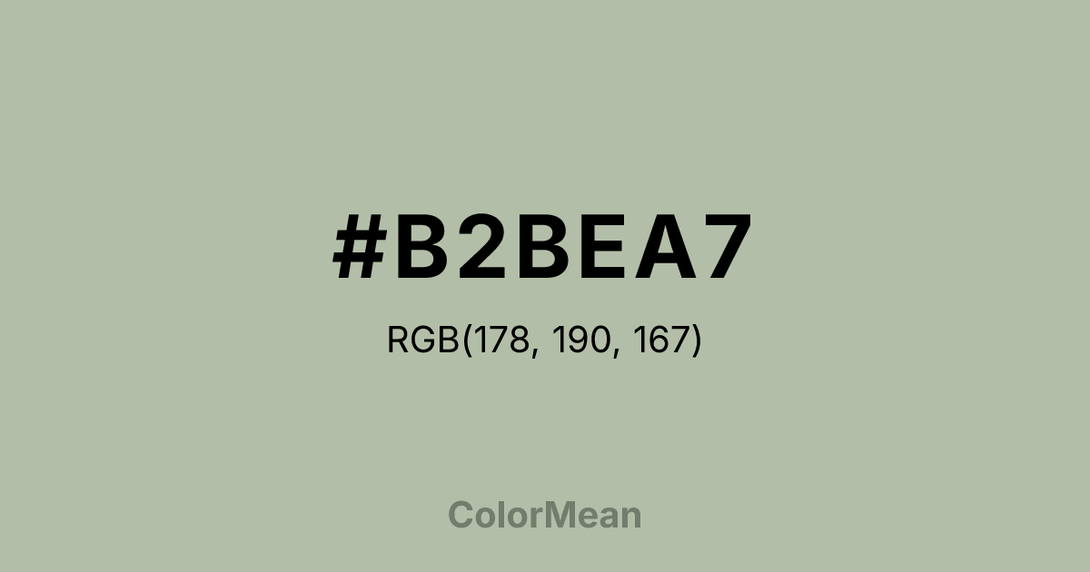 #B2BEA7 RGB value is (178, 190, 167). The hex color red value is 178, green is 190, and blue is 167. Its HSL format shows a hue of 91°, saturation of 15 percent, and lightness of 70 percent. The CMYK process values are 6 percent, 0 percent, 12 percent, 25 percent.